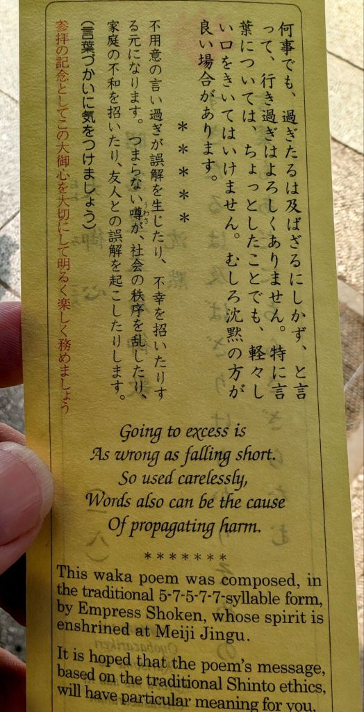 Sure enough at the glorious Meiji Jinku shrine the next day I was able to receive a poem that feels like good advice for this book- writing process. Ah, the power of apophenia…