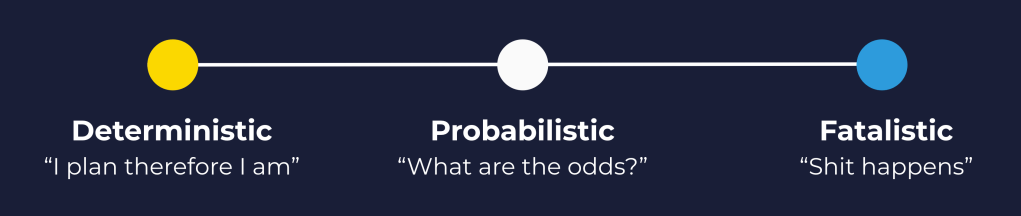 In our culture, our experience of randomness by and large is reactive, and sits somewhere on a spectrum where at one end we pretend we can completely control the world around us and all of our actions drive outcomes (“Deterministic”) and at the other end that we a totally at the mercy of external events and there’s nothing that we can do about it (“Fatalistic”).