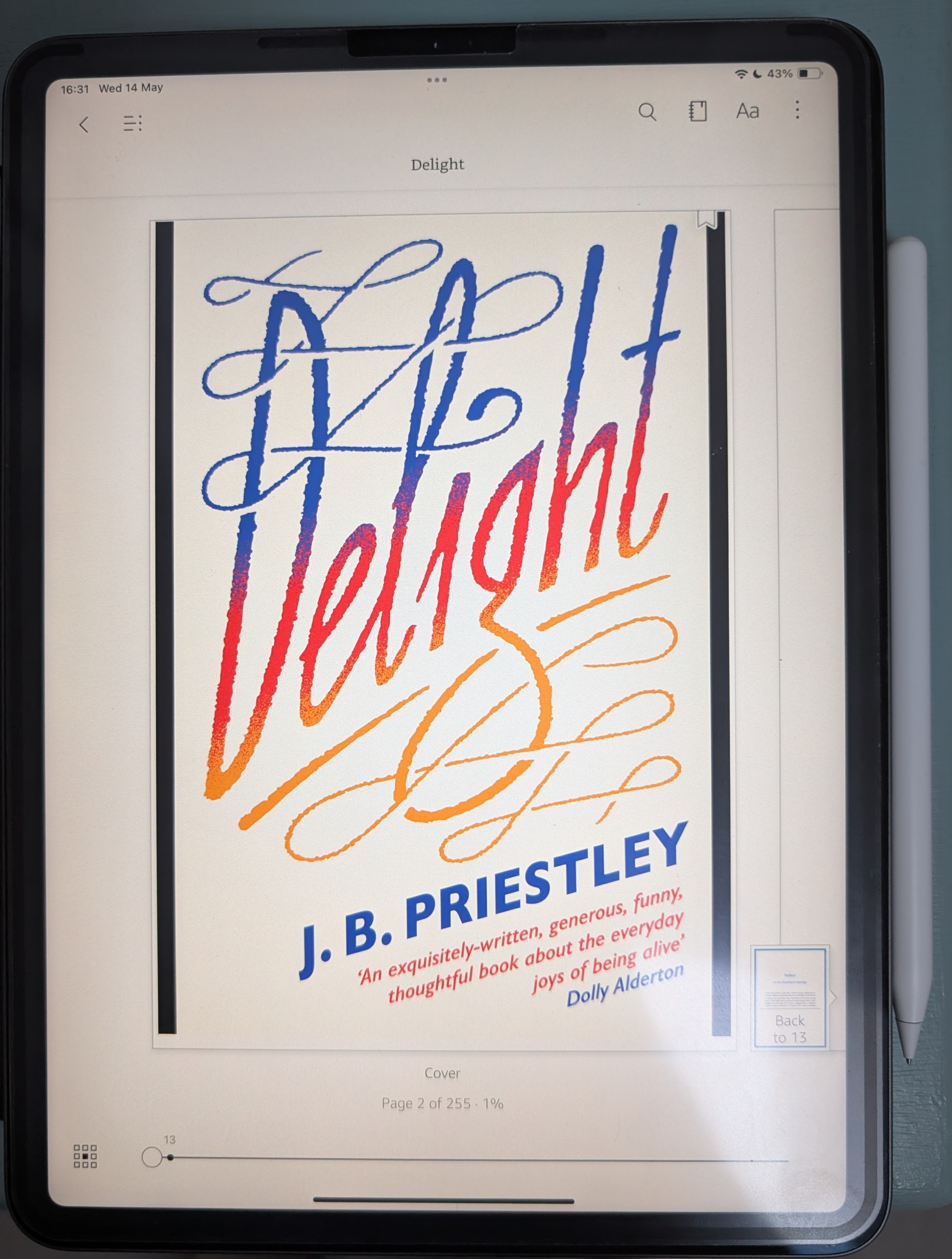 The first was from Lisl Macdonald, who pointed me at a book written in 1949 by JB Priestley called “Delight.” It contains 114 short essays about things that delighted him, from Waking to smell bacon (105) to Orchestras tuning up (89) to Knowing a poet (60) picking a handful at random (appropriately).