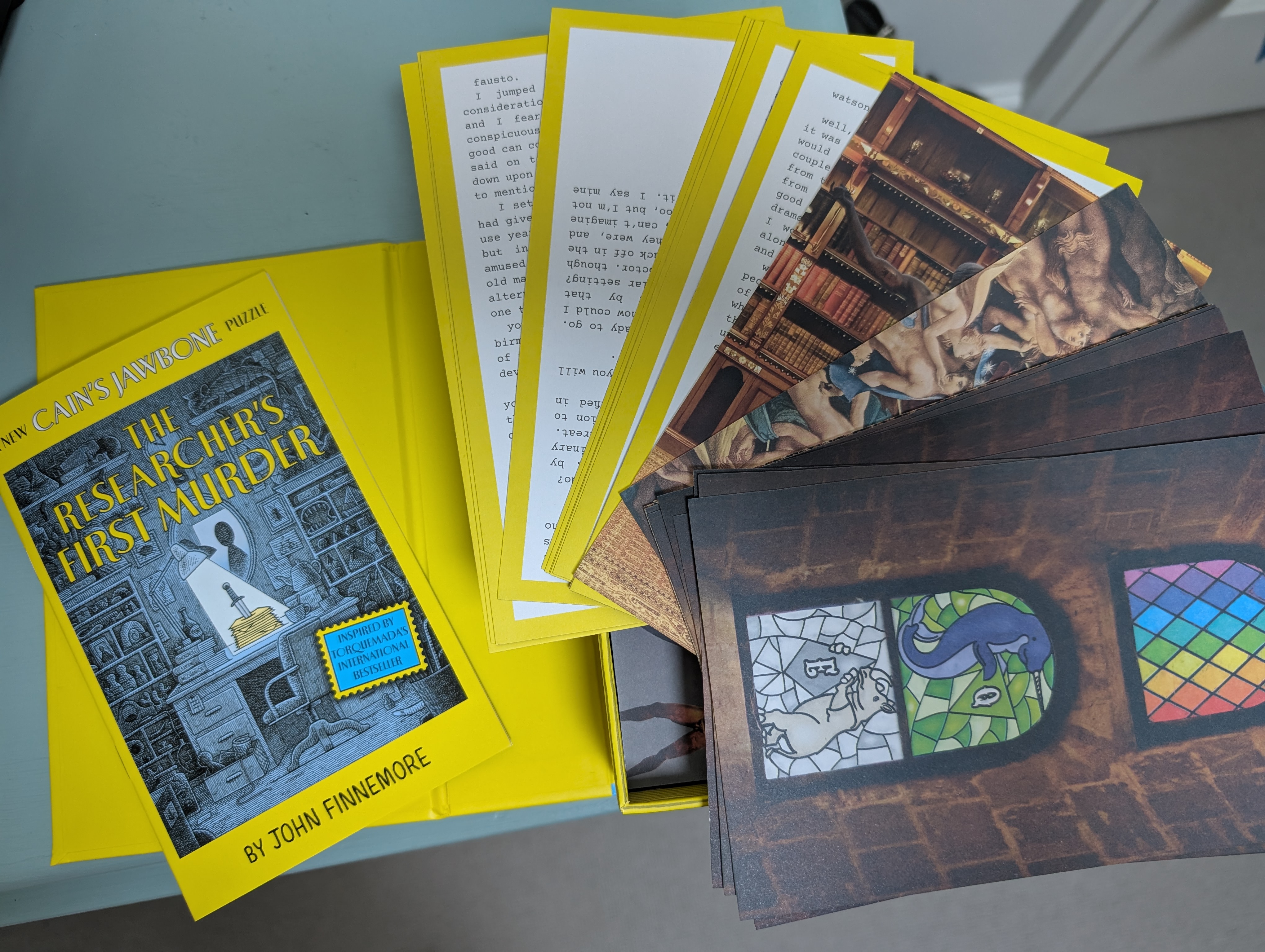 The second was Tamsin Fox-Davies pointing me at an episode of the podcast The Allusionist that told the story of John Finnemore’s The Researcher’s First Murder. Listen to the podcast for the full and fascinating story, but suffice to say John’s “book” is a box containing around 100 postcards, with a picture on one side and a fragment of a story on the other. It’s a murder mystery, far cleverer than anything I could imagine, but it’s a format Nick and I are leaning towards.