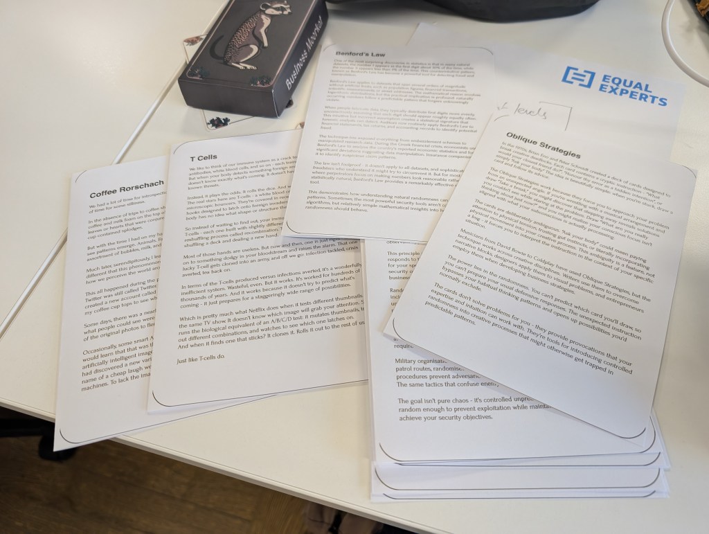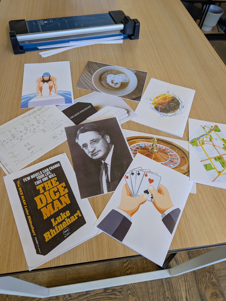 A selection of 10 of the approximately 100 pages/cards that we have already written. Probably not the final images. Slightly wonky printing on an office printer. Will definitely need rounded corners (it makes cards more durable). But the text is legible to even my aging eyes, which is a relief.