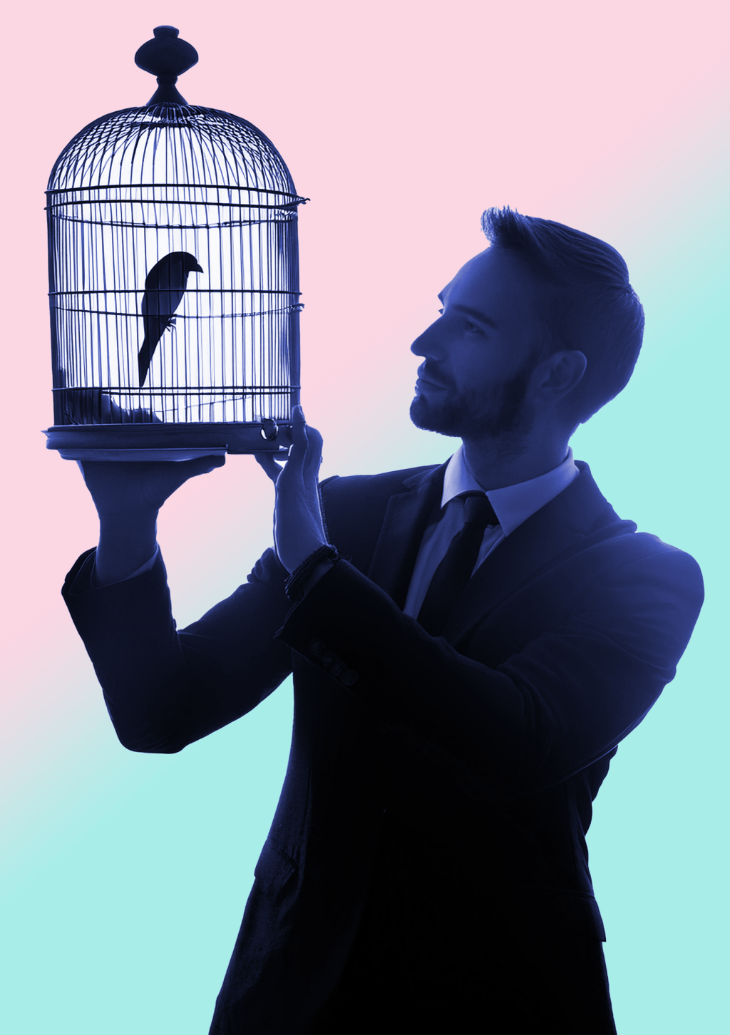 This is one of the handful of LLM-generated images in the book. ChatGPT provided a pretty good response to the request for a man holding a caged bird in silhouette.