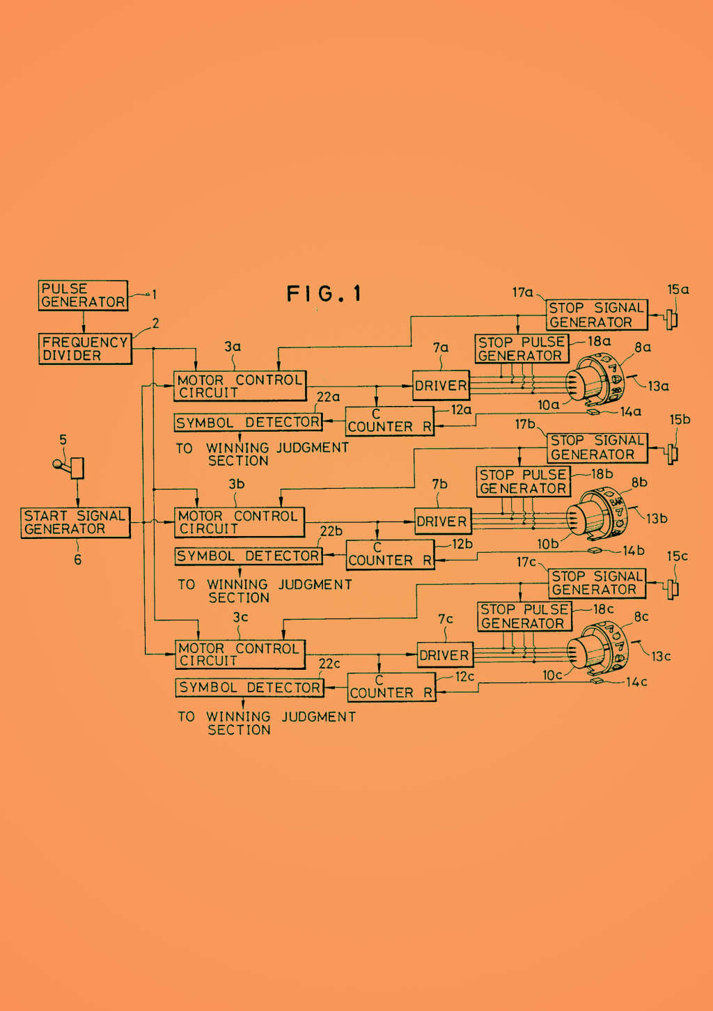 The schematic is taken from a patent for a device to stop the wheels of a slot machine: https://patents.google.com/patent/US4772022